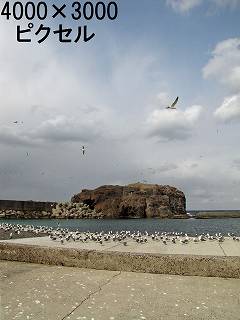 5000羽のウミネコが島と周りの漁港で飛び回っています。